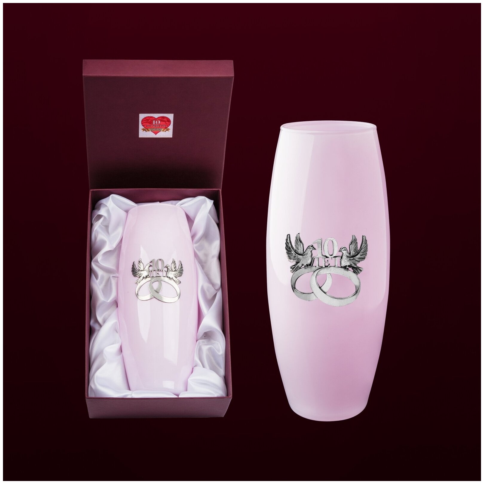 Ваза из стекла окрашенного в нежно-розовый цвет и декорированная оловянным барельефом 10 лет вместе. Презентабельная подарочная упаковка с ложементом отделанным атласной тканью. Эта ваза будет отличным подарком на 10 лет свадьбы.