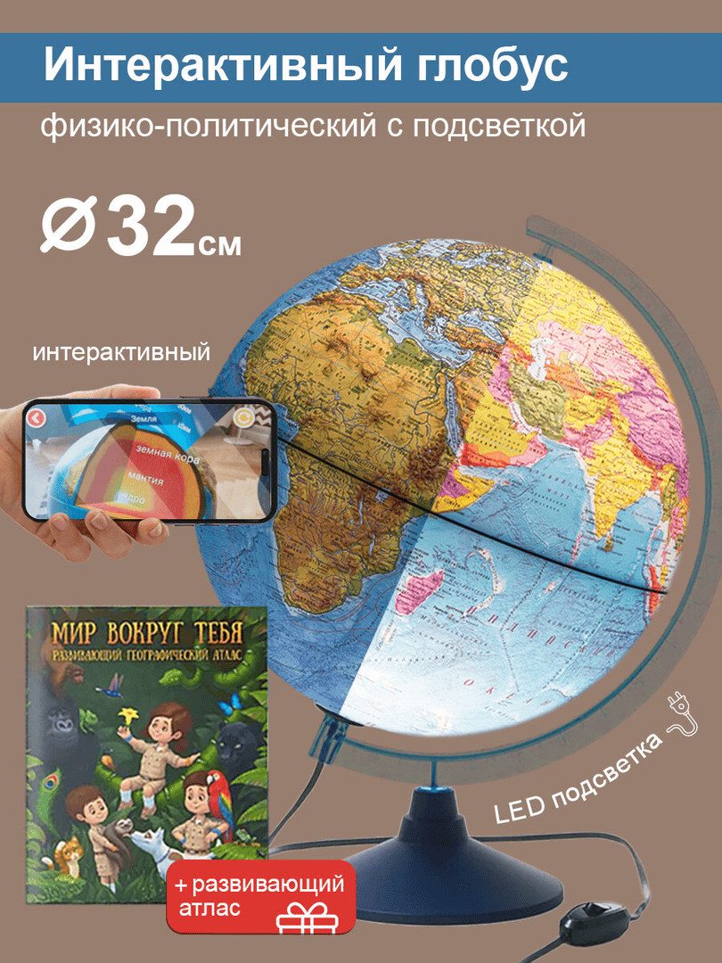 - Интерактивный глобус с LED‑подсветкой + VR очки — помогает изучать географию в игровой форме; интересен и взрослым.