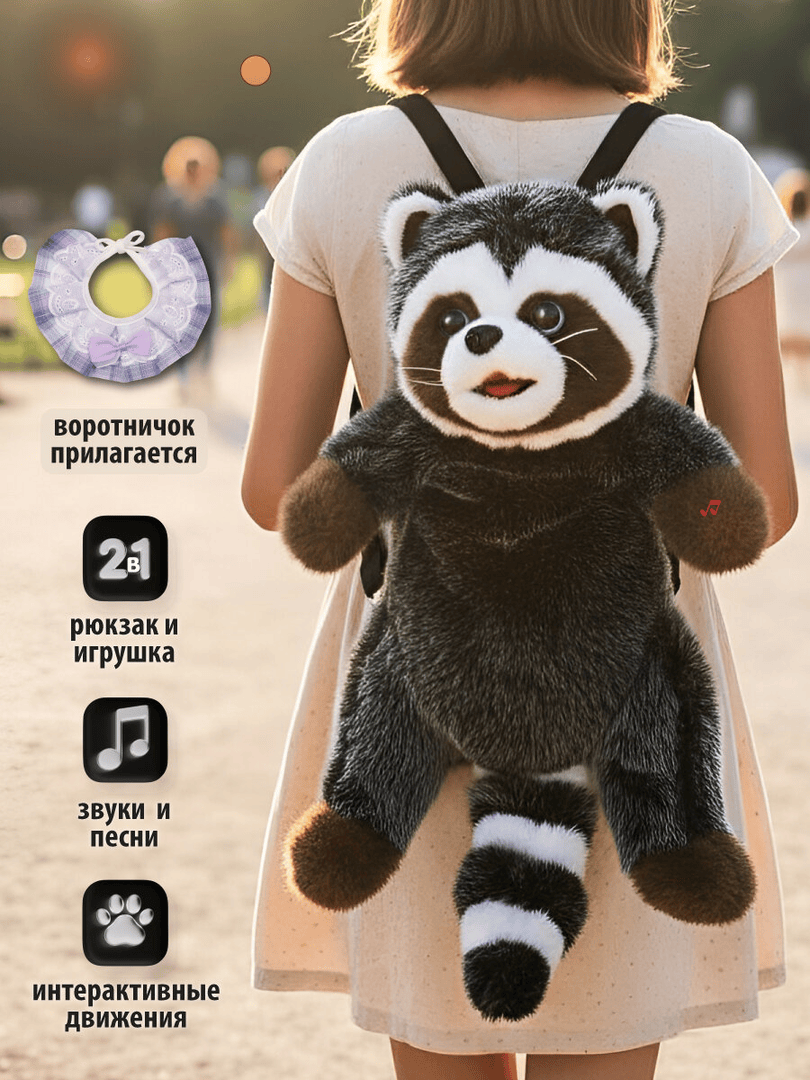 - Два рюкзака «плюшевая игрушка Енот» со звуковым эффектом — функционально и уютно; каждый ребёнок получает свою плюшевую «фишку».