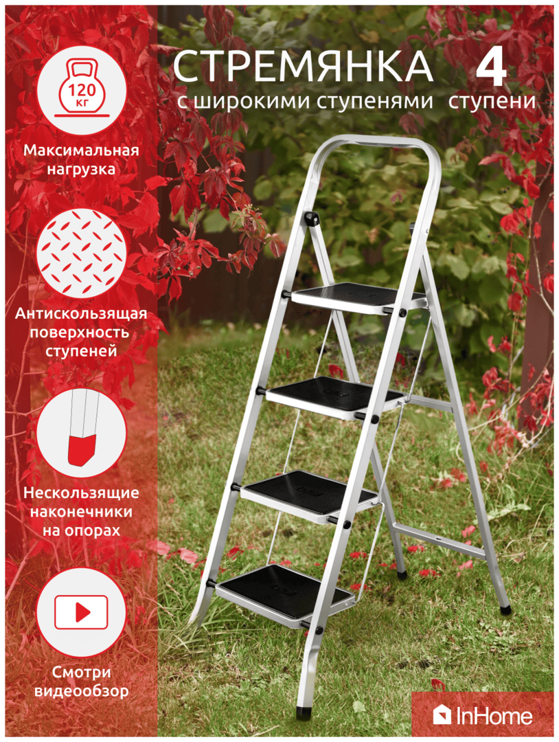 - Стремянка многофункциональная — отложите тонкие модели: лучше прочная, с блокировками и нескользящими ступенями.