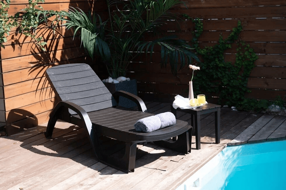 - Шезлонг — выбирайте устойчивую раму (алюминий или сталь с порошковой окраской) и материл, устойчивый к влаге и УФ-лучам.