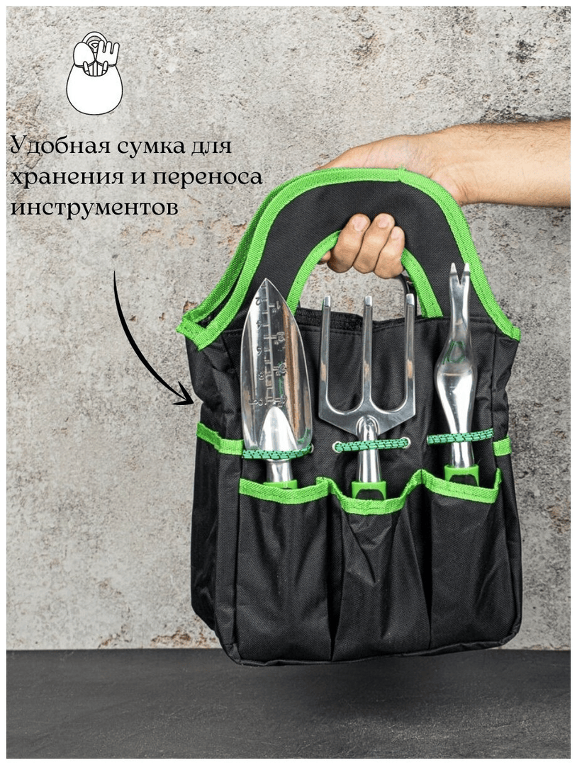 - Набор садовых инструментов в сумке — хорош для начинающего садовода.