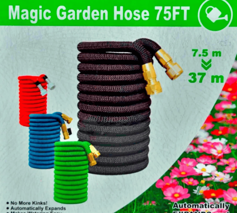 - Шланг растягивающийся с распылителем — удобен при поливе и хранилище компактно.