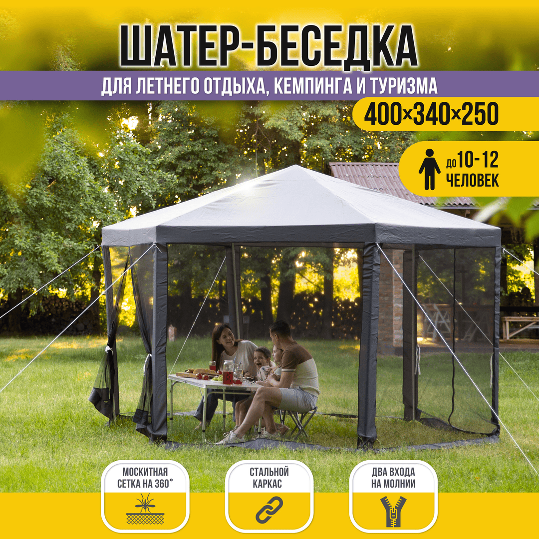 - Шатер беседка — выбирайте модель с прочным каркасом, водонепроницаемой тентовой тканью и возможностью закрепления анкерными тросами.