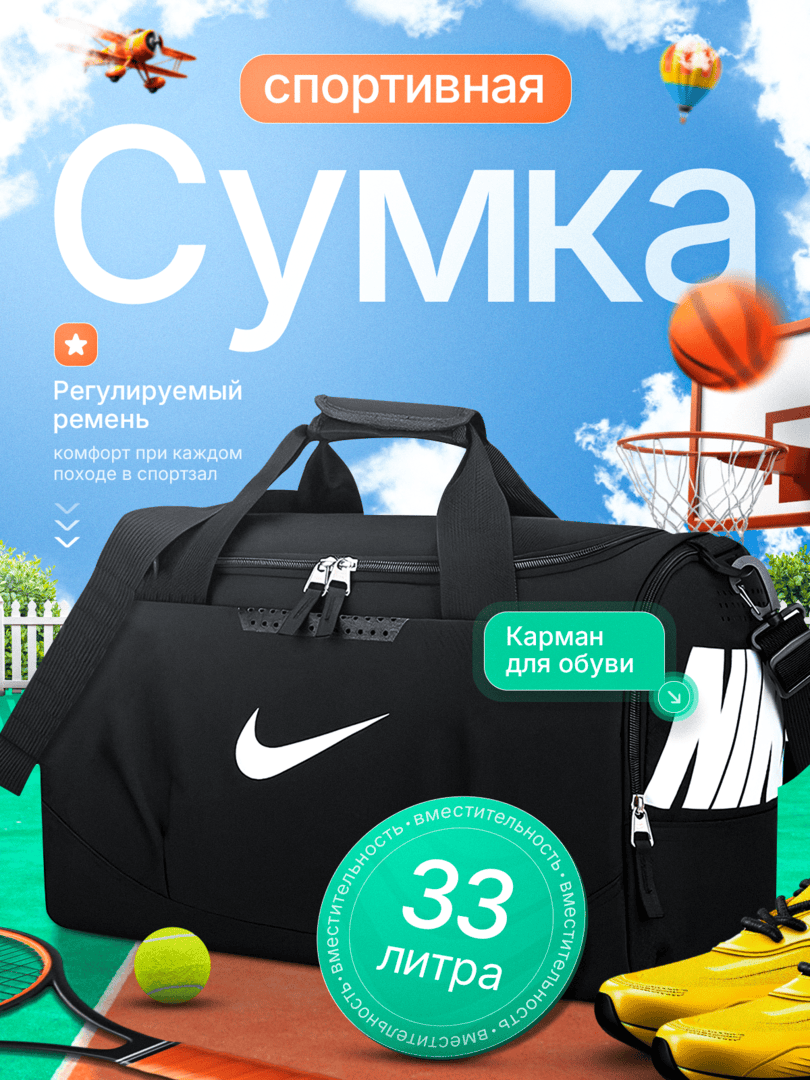 Ищите водоотталкивающий материал, отдельный отсек для обуви, внутренние карманы и удобные ручки/ремень. Размер подбирайте исходя из типа тренировок: фитнесу достаточно среднего размера, для плавания — отдельного места для влажных вещей.
