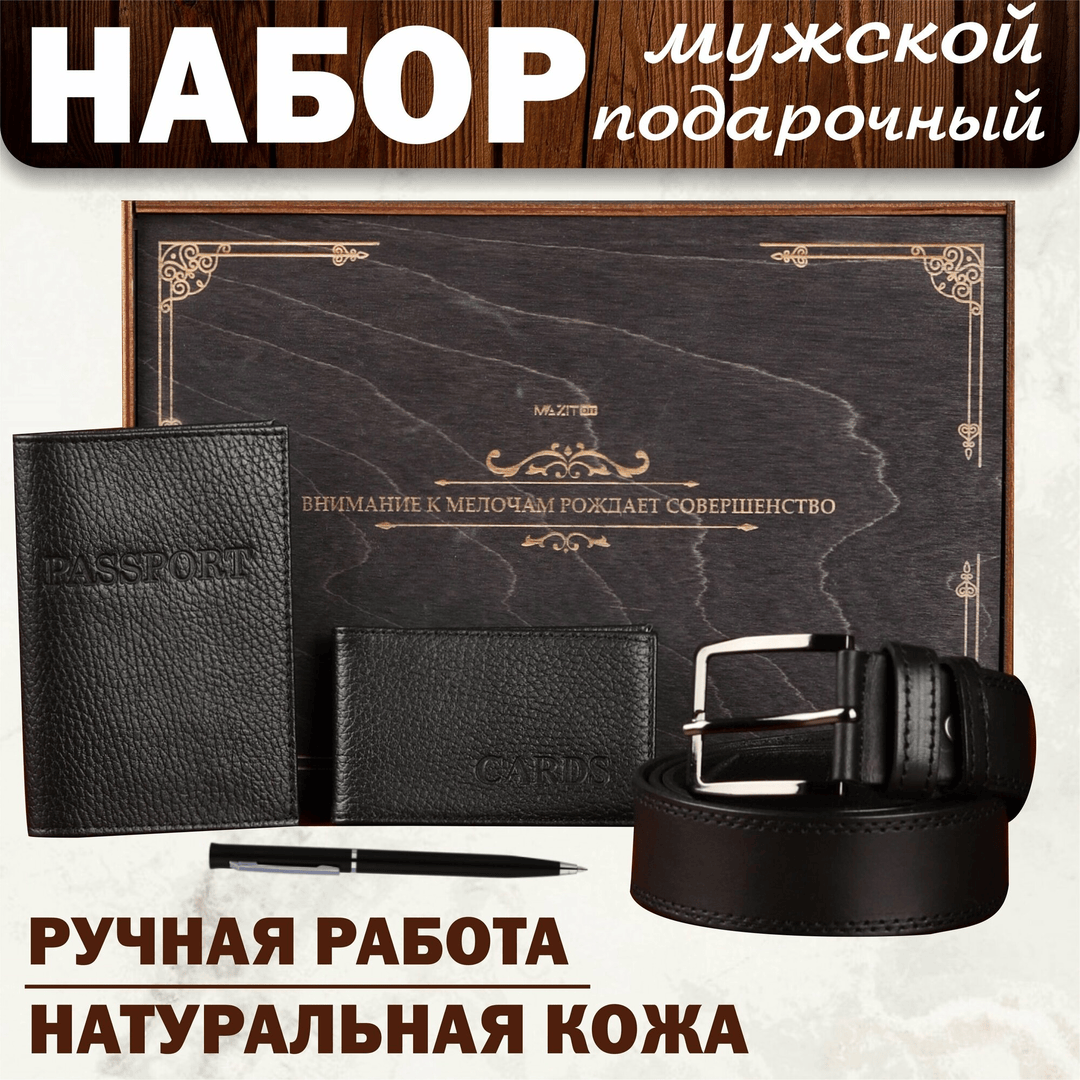 - Стильный солидный мужчина: кожаный набор (ремень, обложка на паспорт, визитница, ручка), качественные аксессуары, аккуратная упаковка и персонализация.