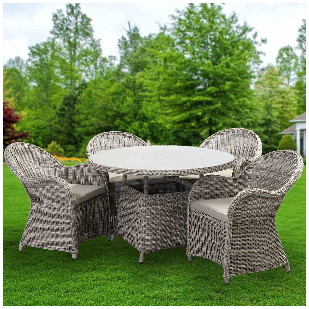 Роскошный комплект плетеной мебели станет отличным дополнением для загородного дома или дачи. Комплект состоит из четырех кресел с подушками и стола со столешницей из стекла. Выполнен из искусственного ротанга, устойчивого к физическому и климатическому воздействию.