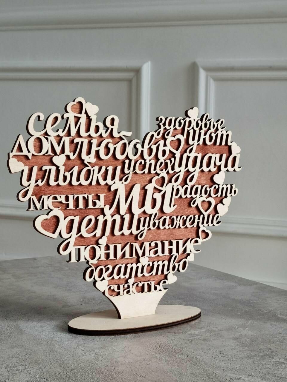 Статуэтка "Интерьерное сердце" выполнена из натурального дерева, что вадно при выборе подарка на деревянную годовщину свадьбы. Такой подарок выражает чувства, ведь слова на этом сердце говорят сами за себя.