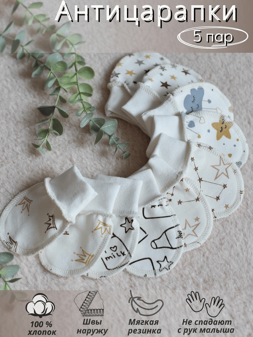 Набор антицарапок — очень практичный и одновременно заботливый подарок для семьи с новорождёнными двойняшками: в комплекте пять пар (тонкие и с мягким начёсом), что особенно удобно при частой смене одежды и стирке. Антицарапки защищают лицо от случайных царапин и мешают сосанию пальцев, плотно держатся за счёт манжет и рассчитаны на малышей от 0 до 2 месяцев — то, что нужно в первые недели после выписки, для визитов в поликлинику или фотосессий. Материал (100% органический хлопок) делает их мягкими и тёплыми, а разнообразие расцветок подходит как для мальчика, так и для девочки. Такой набор порадует родителей, бабушек и дедушек или друзей: он показывает заботу о комфорте малышей.