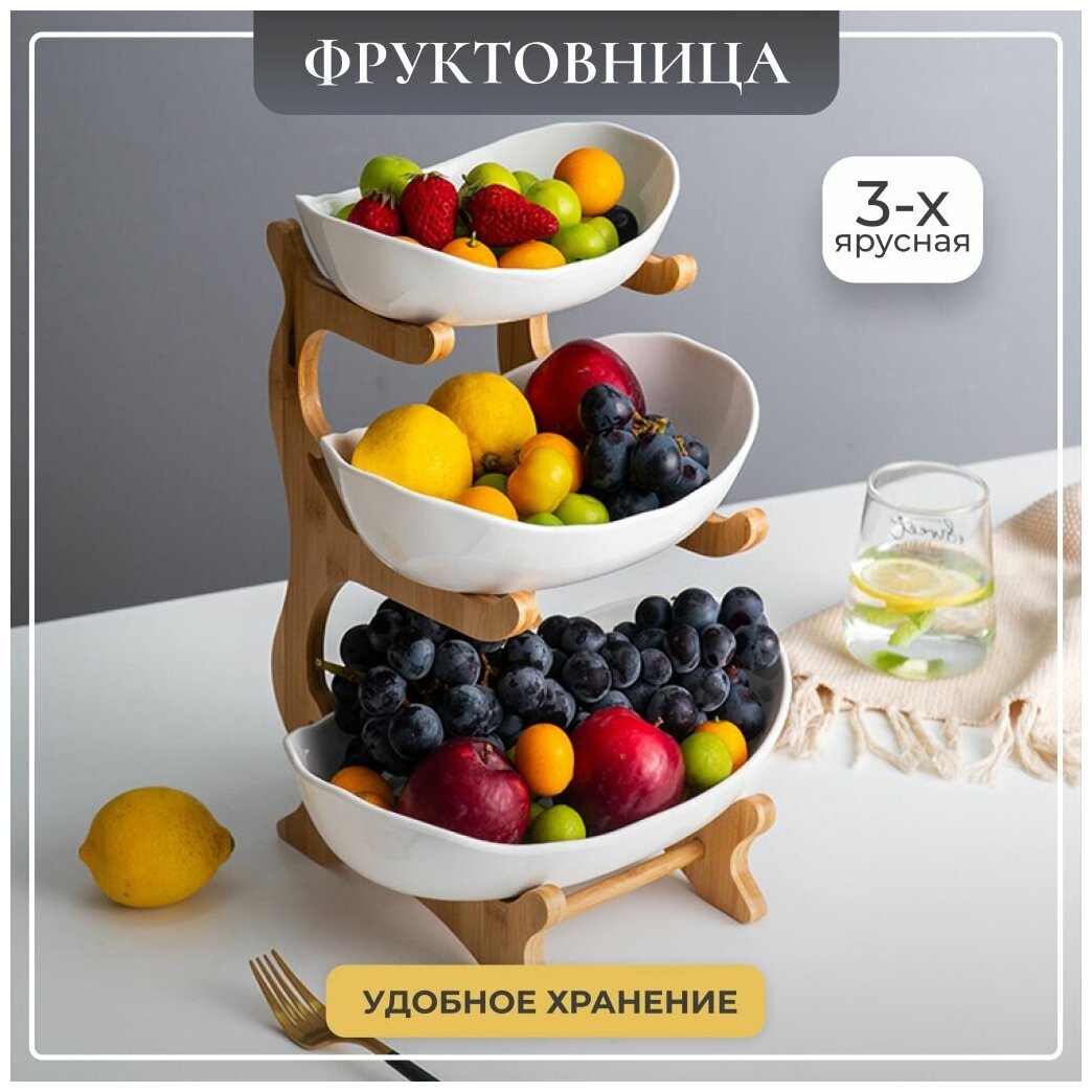 Фруктовница трехярусная отлично подойдет для красивой сервировки и эффектного украшения стола. Стильная этажерка для сухофруктов выполнена в современным дизайне и подойдет под любой кухонный или гостиный интерьер.