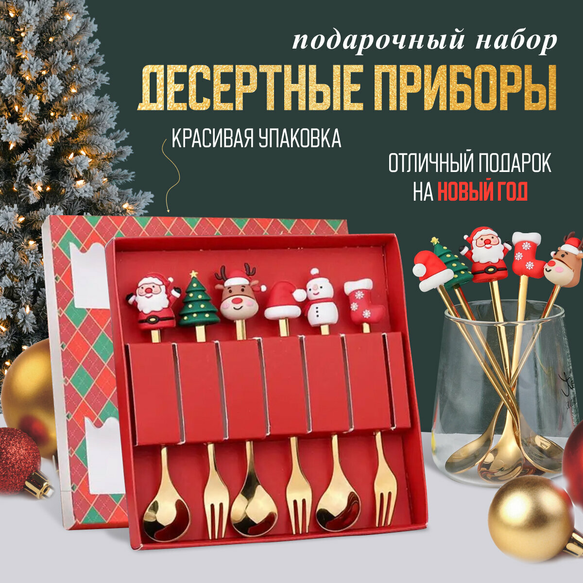 Десертный подарочный набор чайных ложек и вилок, выполненных из нержавеющей стали, с декоративными элементами новогодних украшений с символами Нового Года. Все декоры съемные, поэтому приборы можно будет использовать и после праздников.