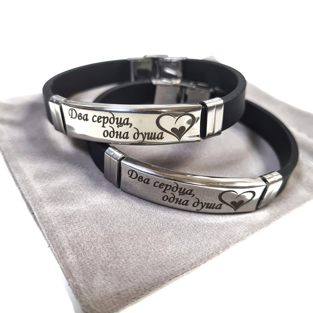 Парные браслеты из силикона и нержавеющей стали с гравировкой "Два сердца одна душа" растрогают родителей.