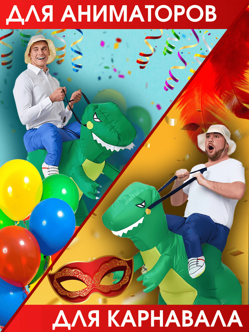 Надувной ростовой костюм «верхом на динозавре» — яркий элемент шоу для аниматора. Быстро надувается насосом, держит форму и превращает ведущего в живой аттракцион, идеально для интерактивных игр и фото. Учитывайте возраст и уровень активности — костюм больше подходит для взрослых или подростков-аниматоров.