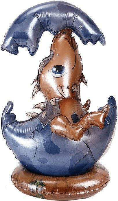 Большой 3D-фольгированный шар в форме динозаврика в яйце — эффектный центральный объект для фотозоны или стола с тортом. Надувать следует воздухом, шар устойчив на подставке и долго держит форму. Хорош для создания «главного героя» праздника, особенно если нужно выделить зону для фотографий.