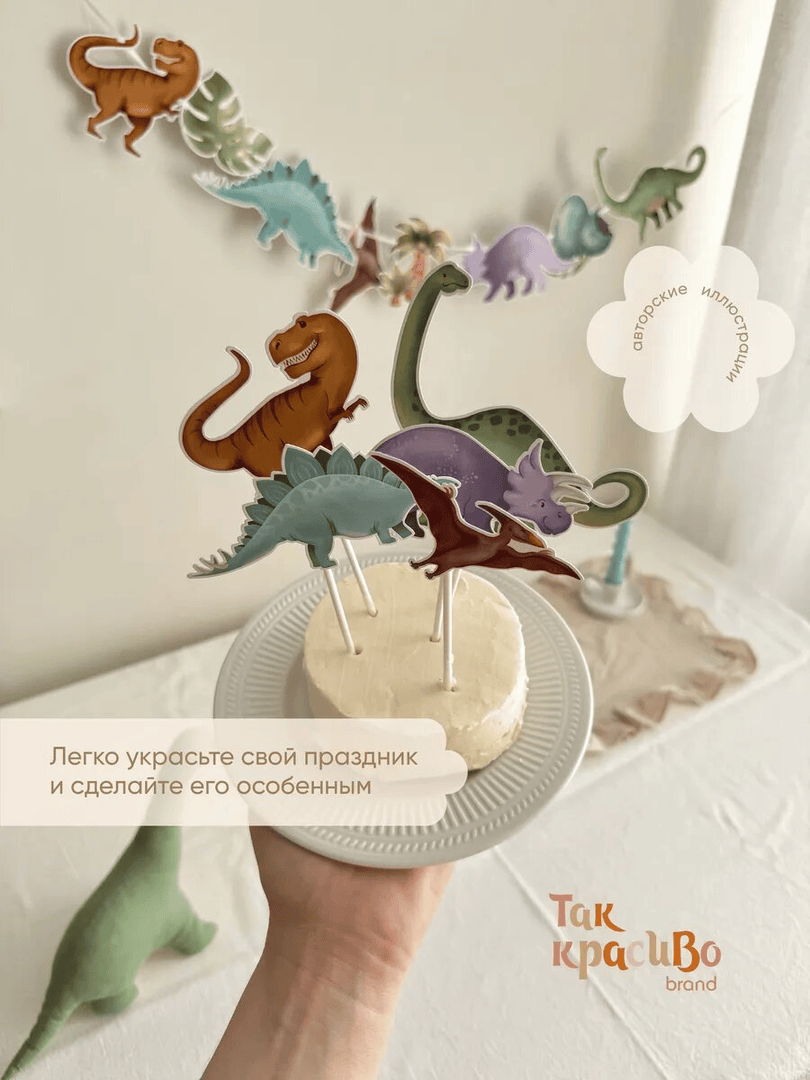 • Набор топперов для торта — лесенка, пальмы, маленькие динозавры и таблички «С Днём рождения».