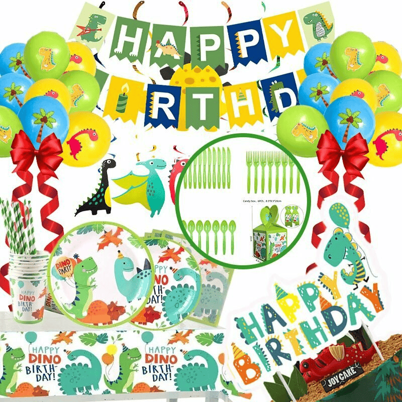 • Одноразовая посуда: тарелки, стаканы и салфетки с динозаврами или нейтральных зелёно-коричневых оттенков. Для малышей выбирайте плотный картон и боксы без мелких деталей.