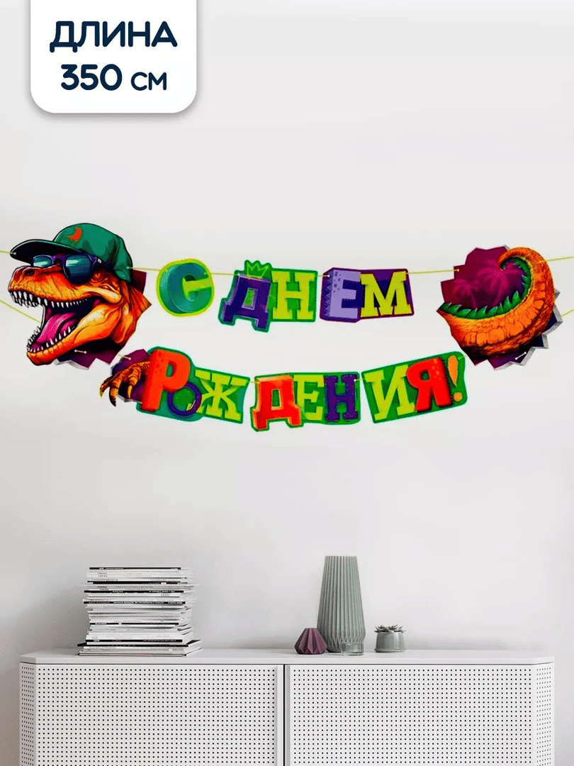 Бумажная гирлянда-растяжка с динозаврами — простой и эффектный декор для стены или над столом. Лёгкая и многоразовая, она выдержит несколько праздников и хорошо сочетается с шариками и фотозоной. Подойдёт для оформления комнаты или как элемент фотозоны.
