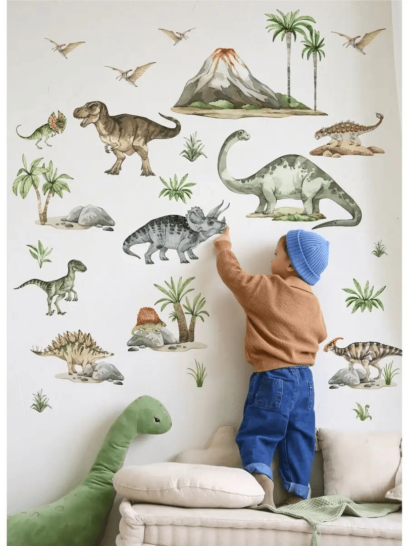 Наклейки для стен с набором динозавров — быстрый способ создать игровую среду в комнате. Их можно клеить на гладкие поверхности, перемещать и комбинировать, создавая сцены и мини-истории.