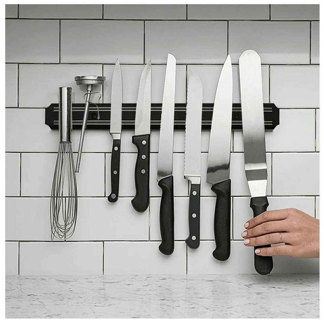 - Магнитный держатель для ножей — безопасно и экономит место на кухне.