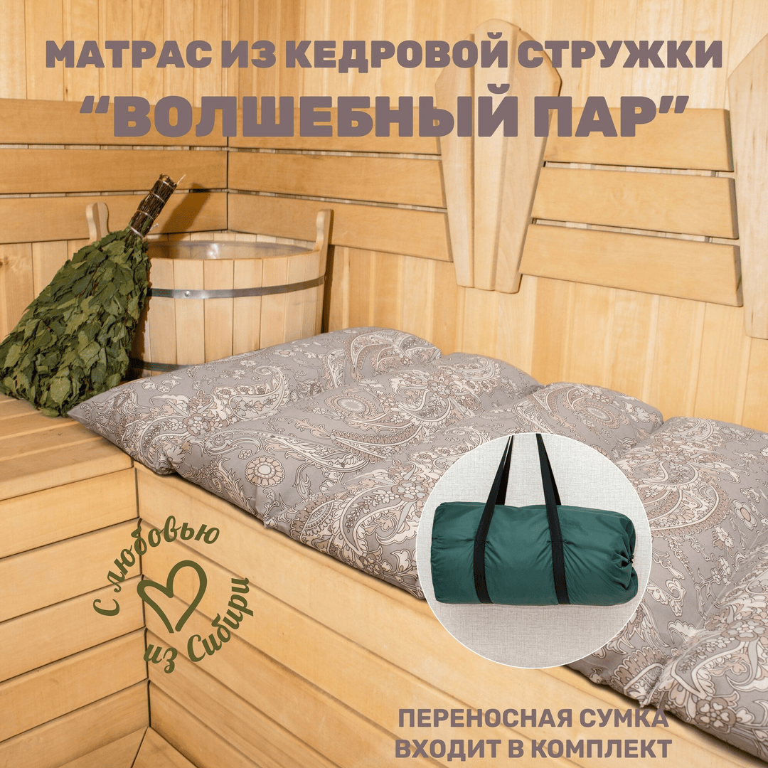 Матрас для бани из кедровой стружки-эффективное средство для ароматерапии! Аромат кедра действует расслабляюще на нервную систему человека., проходят головные боли, общее недомогание, усталость, раздражительность , нормализуется сон. Кедр обладает целительной биоэнергетикой
