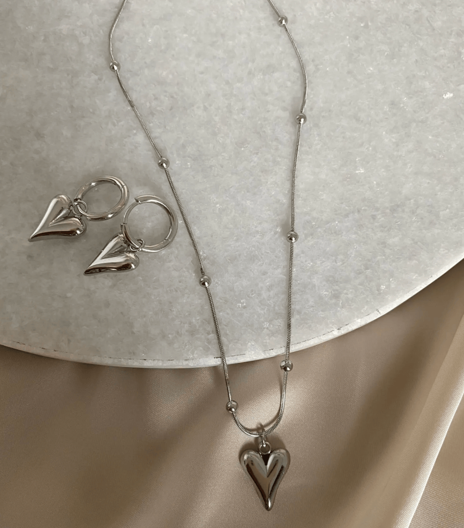 - Комплект украшений в форме сердца — классика, которая редко разочаровывает.