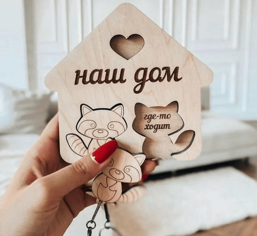 Настенная ключница из дерева — символичный и практичный подарок к деревянной свадьбе: материал напрямую перекликается с пятилетней годовщиной, а долговечность дерева подчёркивает крепость семейных отношений. Такая ключница не только украшает прихожую, но и становится полезным элементом быта — все ключи будут на месте, а интерьер приобретёт естественный акцент.