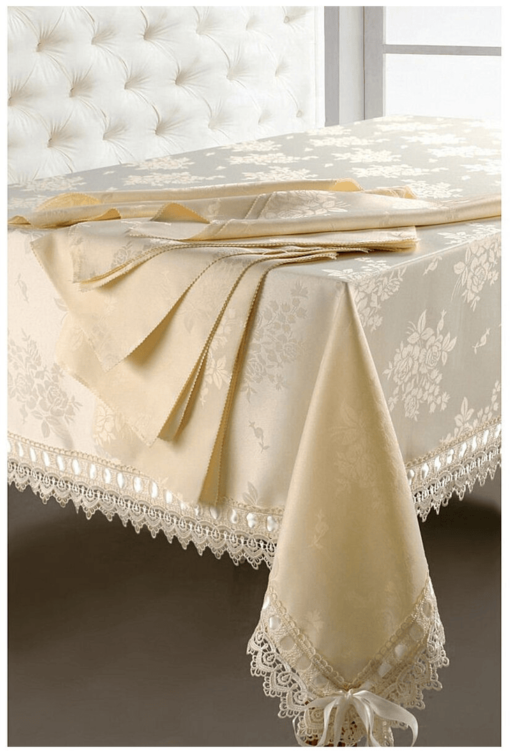 Столовый комплект, выполненный из ацетатного шелка с жаккардовым рисунком, состоит из прямоугольной скатерти и восьми квадратных салфеток. Праздничный комплект на стол.