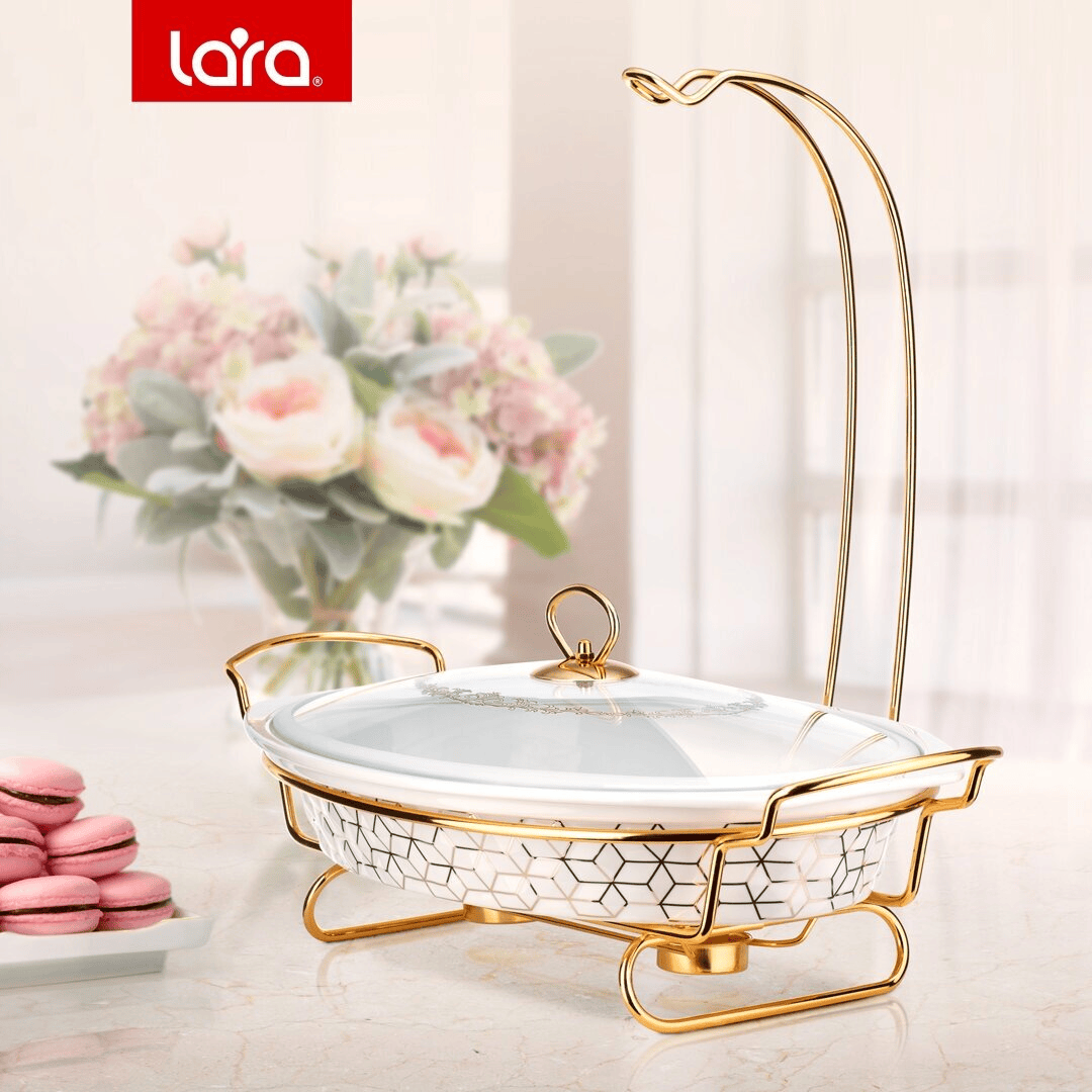 Мармит из жаропрочного фарфора – прекрасное решение для праздничной сервировки. Подогрев от двух свечей сохранит блюдо горячим в течение 1-2 часов без потери вкуса.