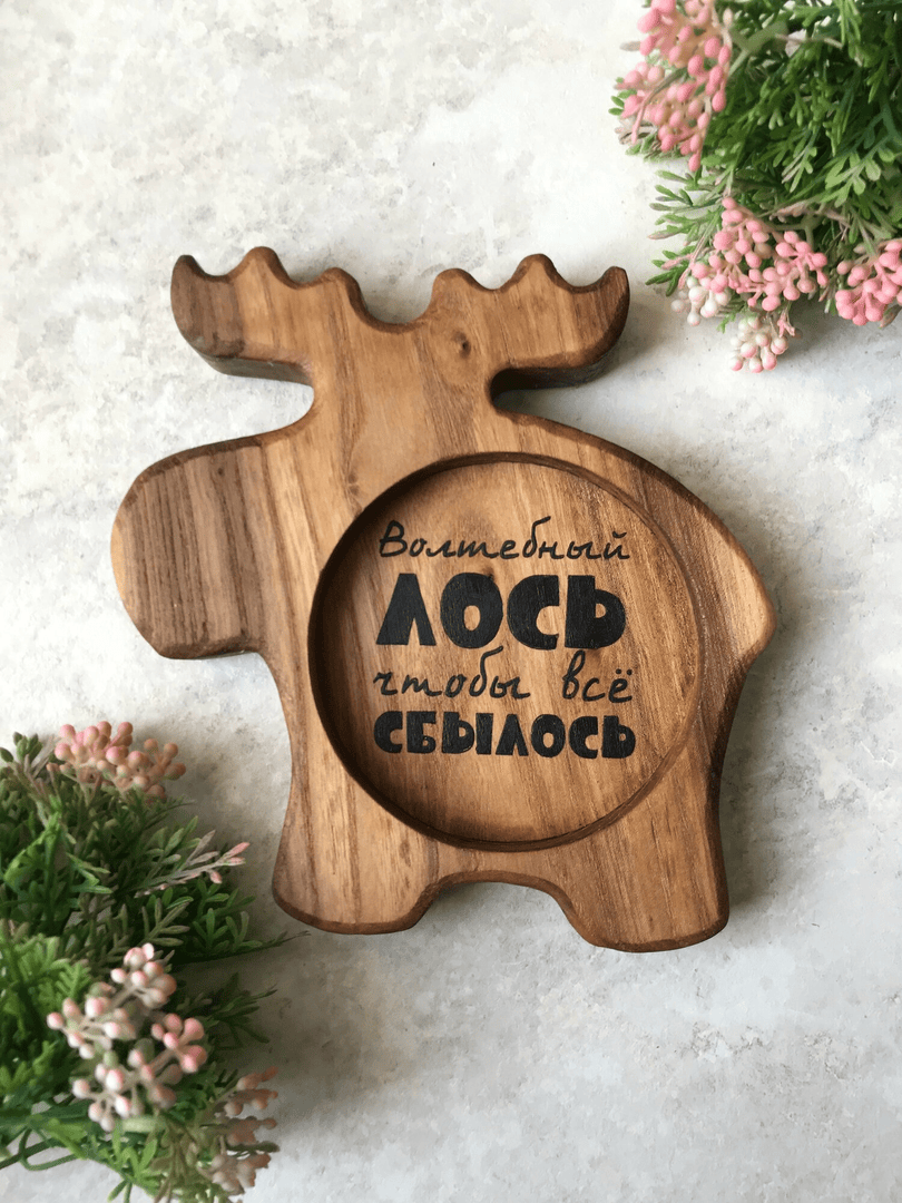 Подстаканник-тарелочка из массива натурального дерева в форме лося с надписью. Оригинальный подарок, для красивой сервировки стола, для эффектной подачи напитков, кружки горячего чая или ароматного кофе. Также подходит для конфет, печенья, орехов, сухофруктов, оливок и масли, сырной и мясной нарезки. Отличный подарок на новый год, день рождения, день матери, 8 марта, день всех влюбленных.