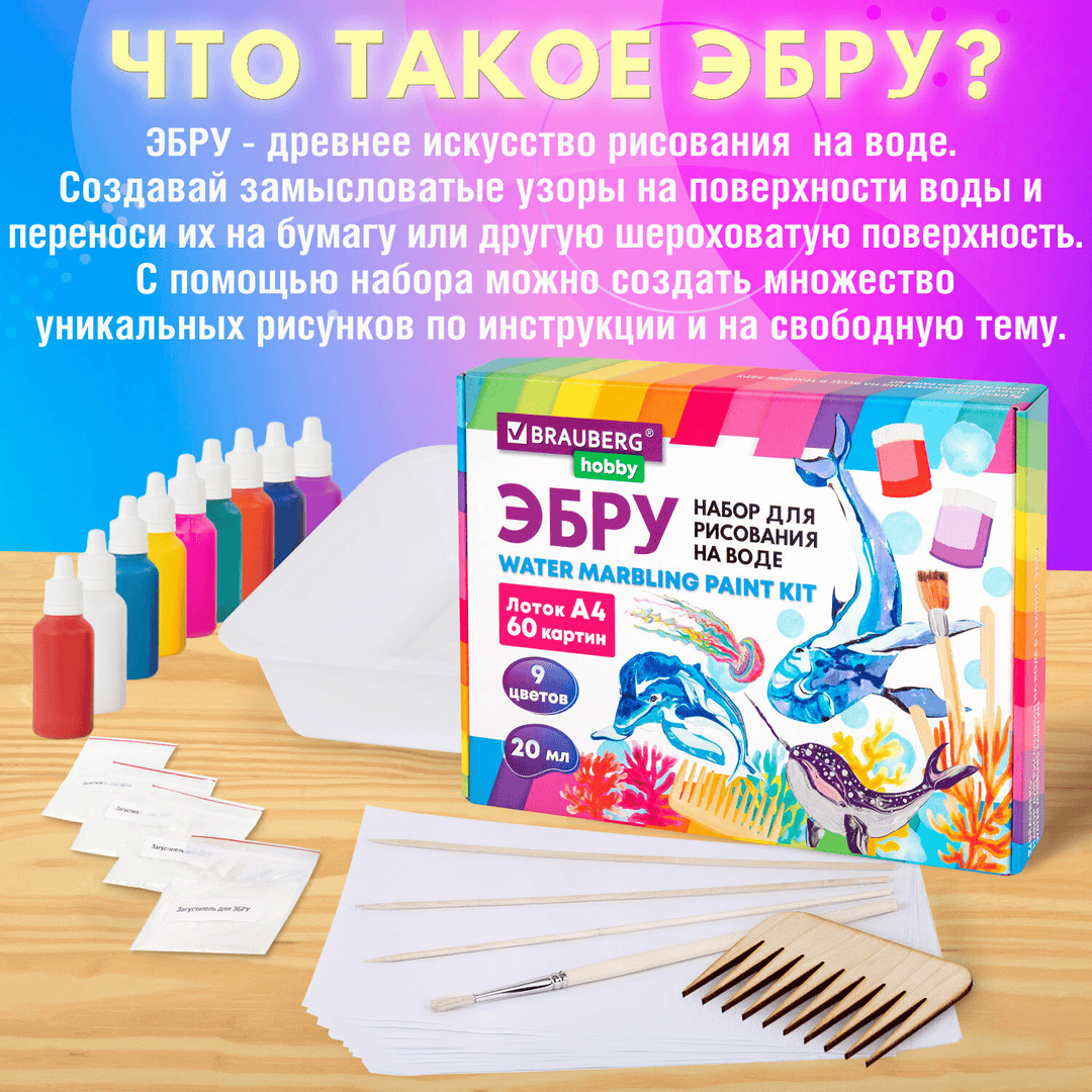 - Два набора для творчества: рисования Эбру — эффектный творческий опыт; следите, чтобы краски были безопасны и легко отстирывались.