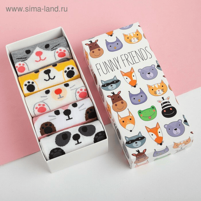- Большой набор детских носочков с забавными животными — и практично, и мило: можно сделать тему «домашние друзья» и подписать пары для каждой.