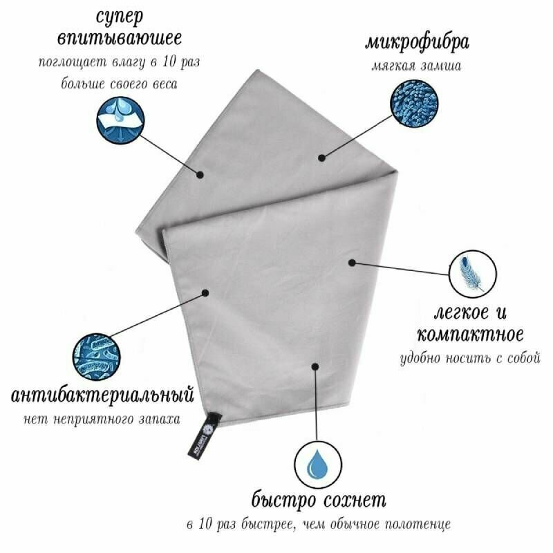 Это компактное быстросохнущее полотенце из особой микрофибры идеально подходит для фитнеса, бассейна, пляжа, командировок, путешествий и в качестве банного полотенца. Полотенце не нуждается в особом уходе, его можно стирать с обычным порошком, при температуре до 50 градусов.
